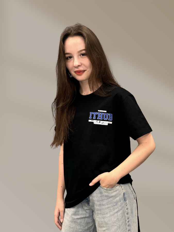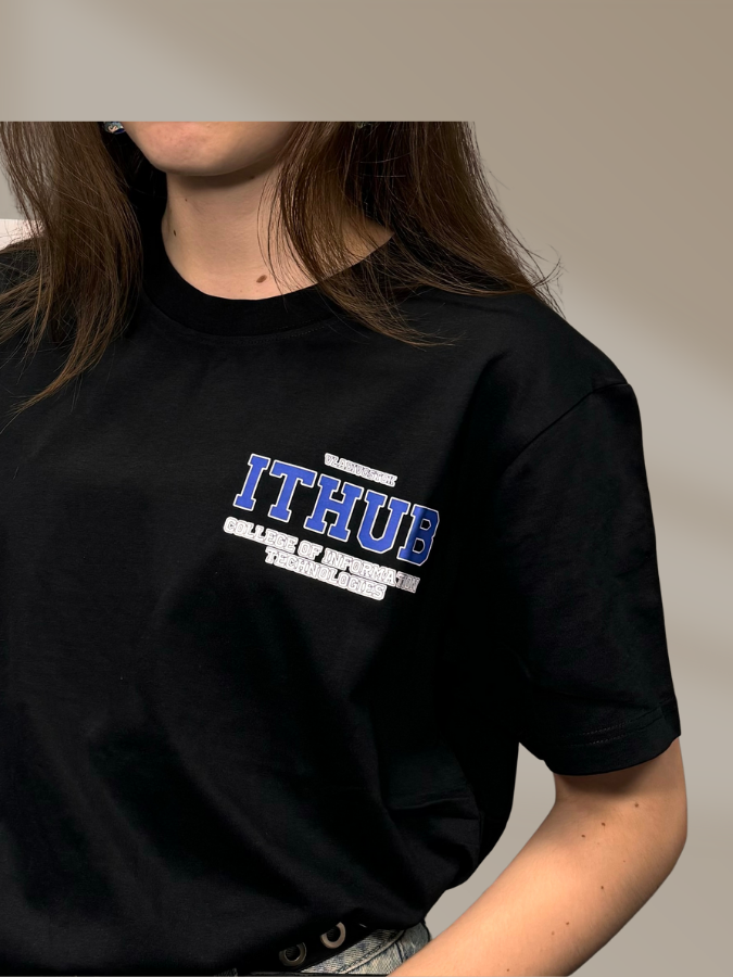 Черная футболка из 100% хлопка, обеспечивающая комфорт и воздухопроницаемость. На груди футболки нанесен логотип IThub, выполненный в классическом стиле американских колледжей. Яркий и стильный дизайн логотипа подчеркивает академический дух и приверженность высоким стандартам образования в сфере IT.